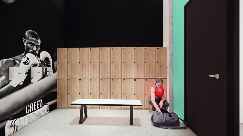 Salle de conditionnement physique moderne au niveau souterrain avec casiers et douches